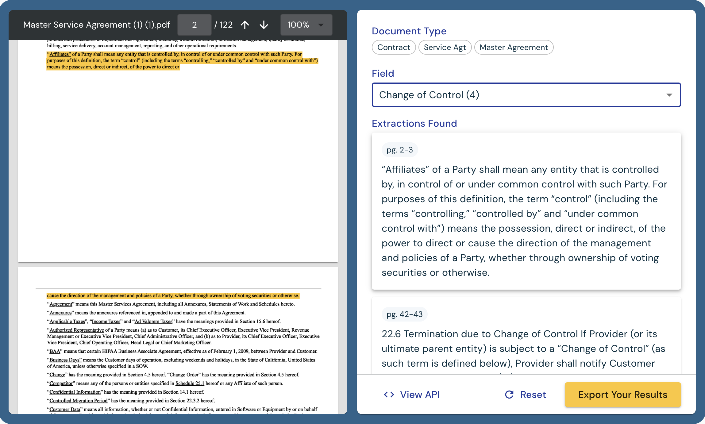 Our free widget allows you to extract change of control and assignment provisions from your contracts in seconds. Only pay if you want to download the results or review multiple documents at once.